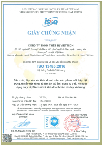 Sản phẩm nồi hấp tiệt trùng của công ty được sản xuất theo tiêu chuẩn chất lượng cao, đã được cấp giấy chứng nhận Đạt quy chuẩn Quốc gia về áp lực (QCVN 01:2008/BLĐTBXH), đảm bảo an toàn tuyệt đối trong quá trình vận hành. Hệ thống quản lý chất lượng chứng nhận ISO 9001 : 2015 và ISO 13485 : 2016, khẳng định quy trình sản xuất nghiêm ngặt, phù hợp cho lĩnh vực y tế và thực phẩm. Bên cạnh đó, Sản phẩm đã được cấp giấy kiểm định tiệt trùng, mang lại hiệu quả xử lý vi sinh tối ưu, góp phần nâng cao chất lượng và độ an toàn cho sản phẩm đầu ra.